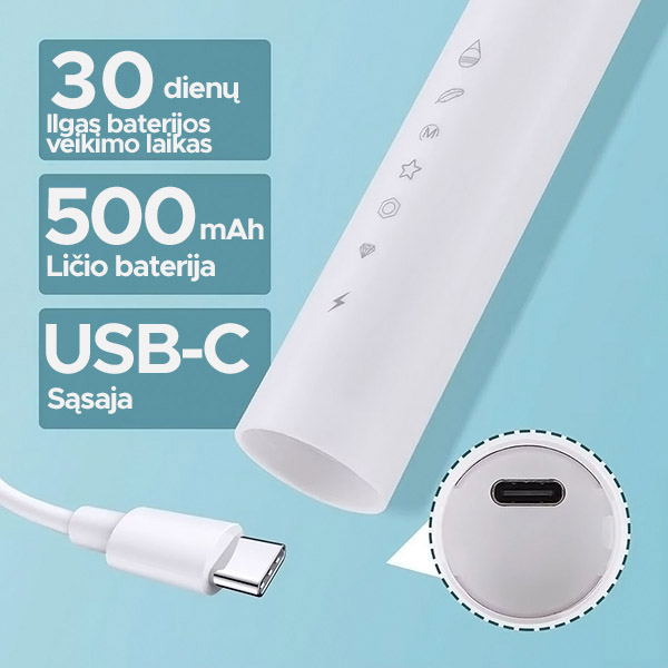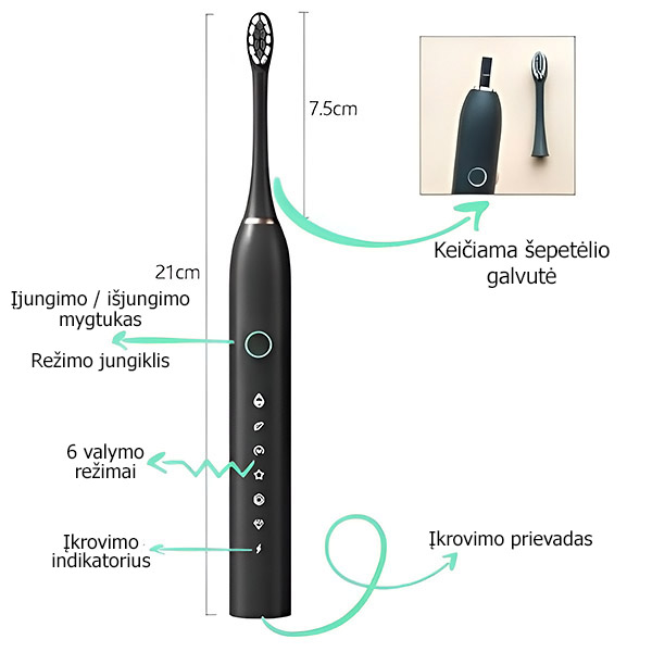 🦷 Galimybė įsigyti pakaitinių šepetėlių galvučių, kad šepetėlis būtų naudojamas ilgiau ir užtikrintų tobulą higieną!