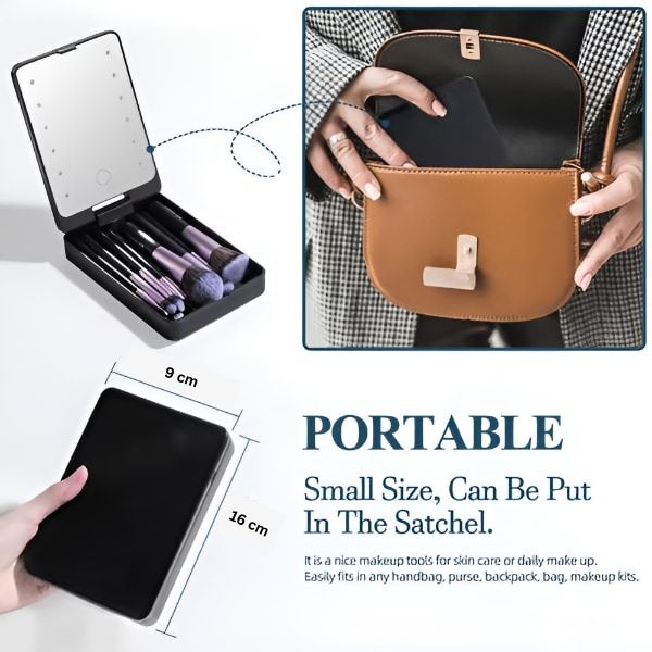 Šepetėlių rinkinys ir LED veidrodėlis puikiai telpa į rankinę, todėl makiažą galėsite lengvai pasidaryti, kad ir kur jus nuvestų diena.