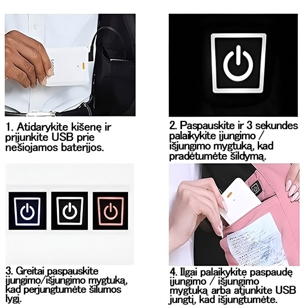 Prijunkite prie bet kokio 5 V/2 A maitinimo banko (į komplektą neįtraukta), kad turėtumėte nešiojamą, ilgai išliekančią šilumą bet kur.