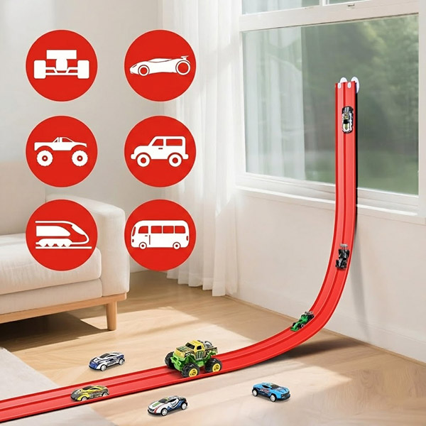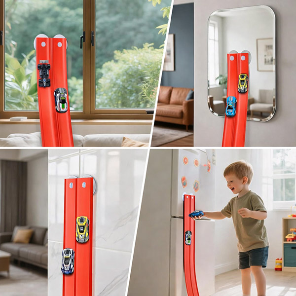 Tvirtinimas su siurbtukais leidžia vaikams ir tėvams greitai keisti kampus ir išdėstymą, todėl trasą galima nuolat perkonstruoti be įrankių ar sudėtingo montavimo.